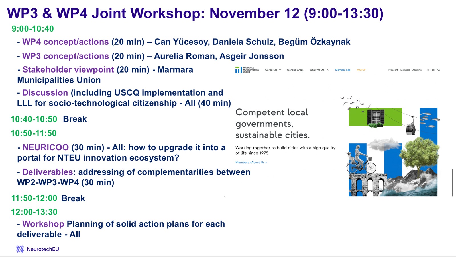 Boğaziçi Üniversitesi'nin kurucu ortakları arasında yer aldığı The European University of Brain and Technology (NeurotechEU) adlı Avrupa Üniversitesi’nin İstanbul'da düzenlenen Board of Rectors (BoR) Toplantısı'nda gerçekleştirilen workshoplardan birinde, üniversite-sanayi iş birliği ve bölgesel kalkınma odaklı çalışmaların yanı sıra, diğer üniversiteler ve Avrupa Üniversite İttifakları ile Pan-Avrupa ve uluslararası ağ ve iş birliklerini genişletme stratejileri ele alındı. İş paketlerinden WP4 (Ortak Politikalar ve Strateji Geliştirme) ve WP3 (Öğrenci ve Personeli Güçlendirme) konuları üzerine yapılan workshopta, Marmara Belediyeler Birliği'nden Görsev Argın Yerel Yönetim Akademisi hakkında bilgi verdiği bir sunum gerçekleştirdi. NTÇP AR-GE Okulu, yerel yönetimler alanında mevzuat ve vizyon geliştirici çalışmalara alan açarak özgün eğitim programları sunan uygulama odaklı ilerleyen Yerel Yönetim Akademisi ile iş birliği kurulmasını hedeflemektedir.