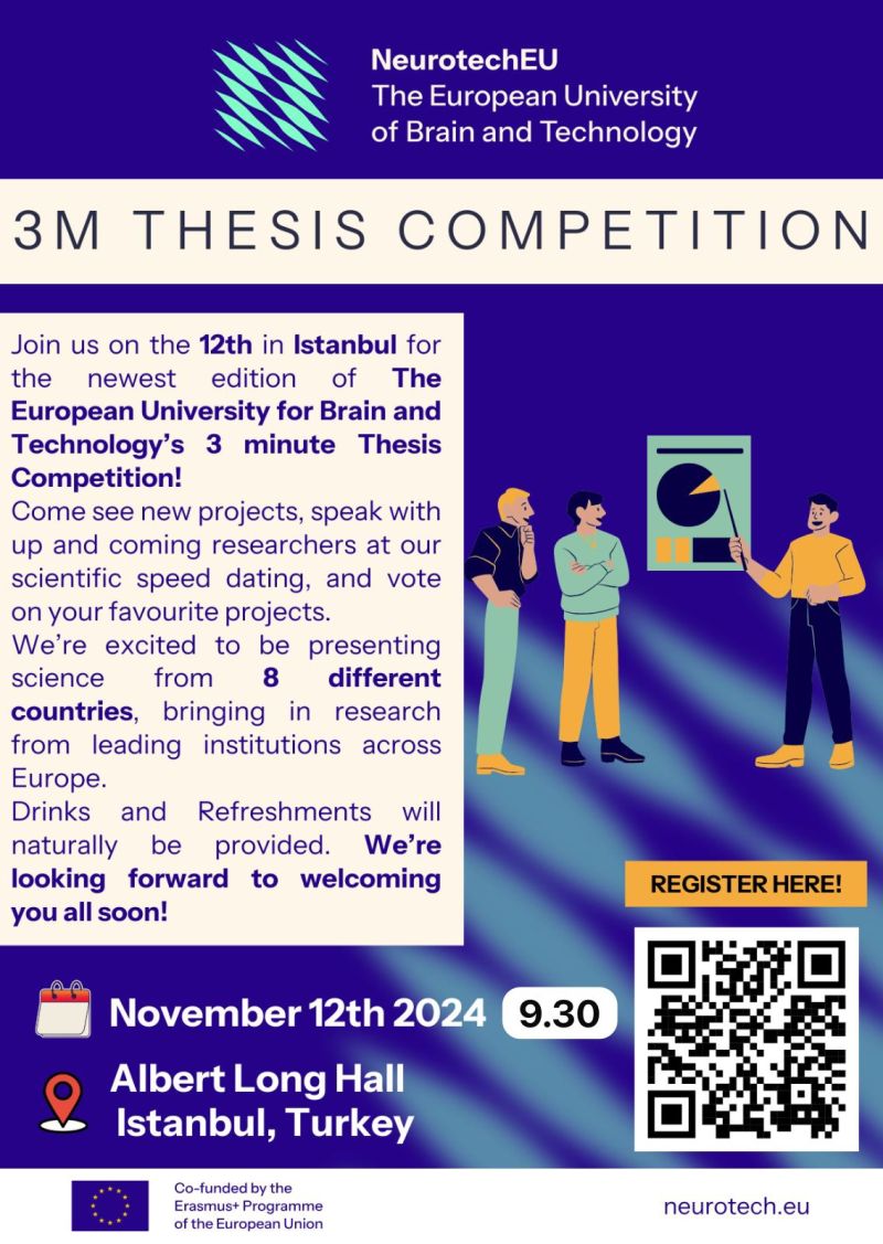 NTÇP kapsamında yapılması planlanan "3 MINUTE THESIS" yarışması, Boğaziçi Üniversitesi'nin kurucu ortağı olduğu The European University of Brain and Technology (NeurotechEU) adlı Avrupa Üniversitesi’nin İstanbul'da gerçekleşen 8. Board of Rectors (BoR) Toplantısı etkinliğinde düzenlendi. 12-14 Kasım 2024 tarihlerinde Boğaziçi Üniversitesi Güney Kampüsü'nde gerçekleşen etkinliğin birinci gününde Türkiye'den 4, Avrupa'dan 8 öğrenci katılım gösterdi. NTÇP'nin P11 projesi araştırmacılarından Pınar Özbay’ın yüksek lisans öğrencisi Belal Tavashi, bir yüksek lisans ve bir doktora öğrencisinin ödüllendirildiği yarışmada kazananlar arasında yer aldı.